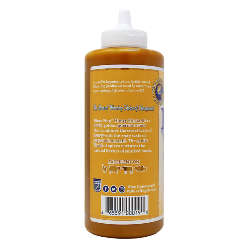 De Blues Hog Honey Mustard BBQ sauce in handige knijpfles, een ware klassieker. In Nederland gebruiken we vaak honing-mosterd saus op broodjes gezond of salades. Daar is hij een aanrader voor, maar vooral geschikt voor alle soorten vlees, gevogelte, vis en groenten. Onze persoonlijke favoriet zijn gepaneerde Chicken strips (Kipfilet reepjes met panko) met deze saus, maar de Honey Mustard is ook lekker bij een kalkoenpoot of schnitzel. Hij is vol van smaak, verveelt niet en je blijft ervan eten, dippen etc. Zoals elke Blues Hog saus, zit de Blues Hog Honey Mustard ook diep verweven in het Amerikaanse BBQ wedstrijdcircuit. Veel barbecue-teams in de VS gebruiken hem als basis. Niet verwonderlijk door zijn volle en bijzondere smaak. Een stroperige, Honing/ Mosterd BBQ saus met een zuurtje als bijsmaak.