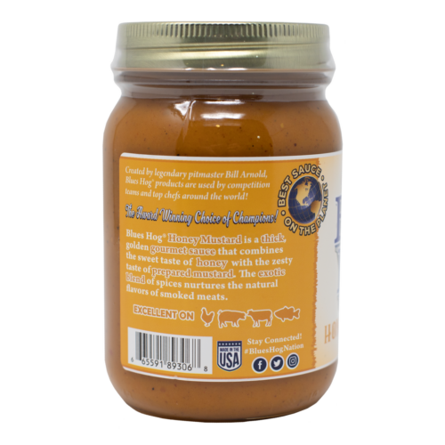 De Blues Hog Honey Mustard BBQ sauce, een ware klassieker. In Nederland gebruiken we vaak honing-mosterd saus op broodjes gezond of salades. Daar is hij een aanrader voor, maar vooral geschikt voor alle soorten vlees, gevogelte, vis en groenten. Onze persoonlijke favoriet zijn gepaneerde Chicken strips (Kipfilet reepjes met panko) met deze saus, maar de Honey Mustard is ook lekker bij een kalkoenpoot of schnitzel. Hij is vol van smaak, verveelt niet en je blijft ervan eten, dippen etc. Zoals elke Blues Hog saus, zit de Blues Hog Honey Mustard ook diep verweven in het Amerikaanse BBQ wedstrijdcircuit. Veel barbecue-teams in de VS gebruiken hem als basis. Niet verwonderlijk door zijn volle en bijzondere smaak. Een stroperige, Honing/ Mosterd BBQ saus met een zuurtje als bijsmaak.