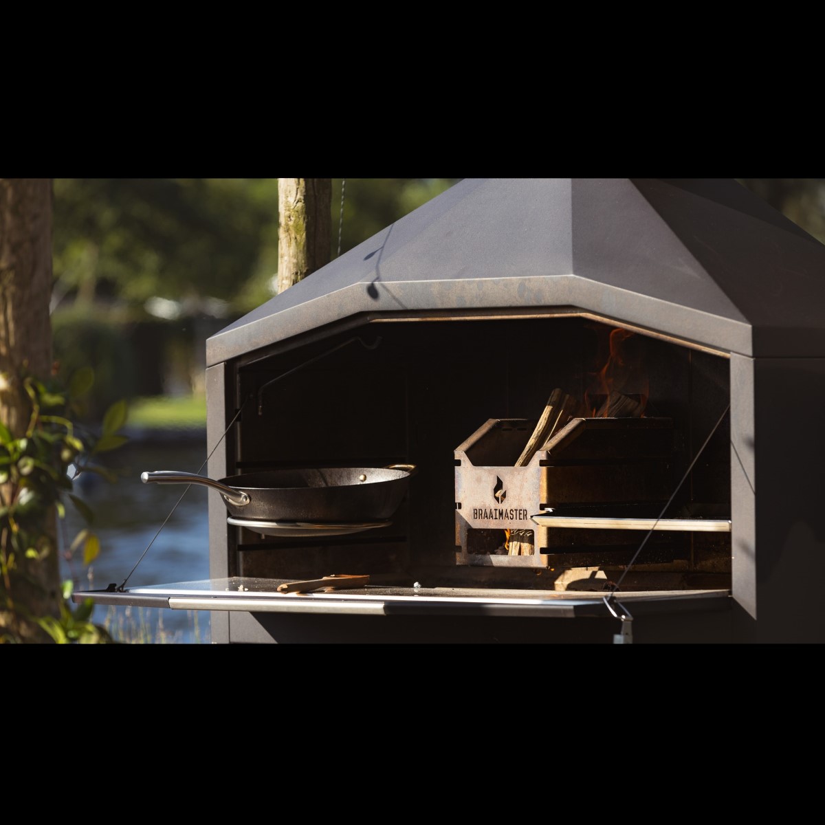 De Braaimaster Vrijstaand Duo Black is een aanwinst voor elke tuin of veranda. Met de Braaimaster kunt u koken zoals men dat al generaties doet in zuid-Afrika, en dat is met open vuur waarbij u zelf uw kolen maakt met de firebox. En maak de sfeer compleet door met het haardrooster de braai om te toveren tot een buitenhaard. Dit model kan zowel vrijstaand in de tuin worden neergezet of ingebouwd worden onder bijvoorbeeld een veranda. Eveneens zijn er zijtafels te verkrijgen en diversen andere accessoires voor de Braaimaster braai’s. De braai kan zowel vrijstaand in de tuin worden neergezet op een eigen onderstel of ingebouwd worden onder bijvoorbeeld een veranda. Talloze mogelijkheden zijn beschikbaar met deze opstelling. En zo kunt u uw eigen buitenkeuken creeën met uw persoonlijke wensen.