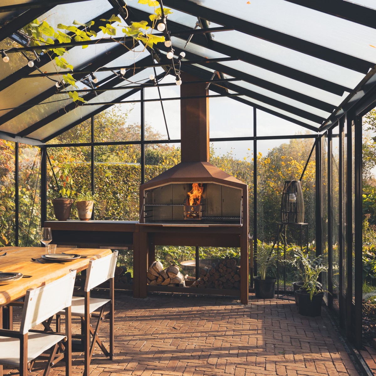 - Inclusief: onderstel voor houtopslag, schoorsteen, geïntegreerde trekkap, kolenmaker, kolenpan, 2x RVS grillrooster, RVS pook, RVS haak.