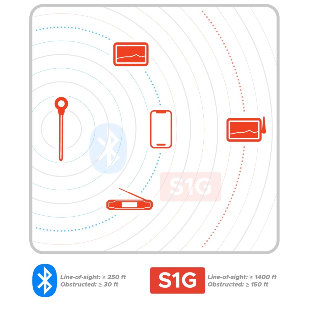 De Pulse draadloze thermometer verzendt gegevens naar elk met de cloud verbonden FireBoard-apparaat via S1G of Bluetooth. Standaard functioneert de thermometer als een draadloze Bluetooth-vleesthermometer die rechtstreeks met uw smartphone is verbonden. Voeg een S1G-antenne toe aan uw FireBoard 2 en koppel deze aan de Pulse voor een aanzienlijk groter bereik. Zelf met meerde Pulse probes kun je één antenne gebruiken.