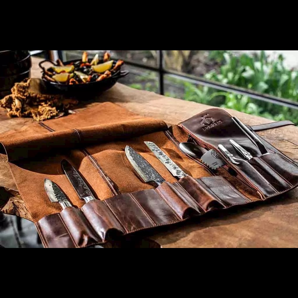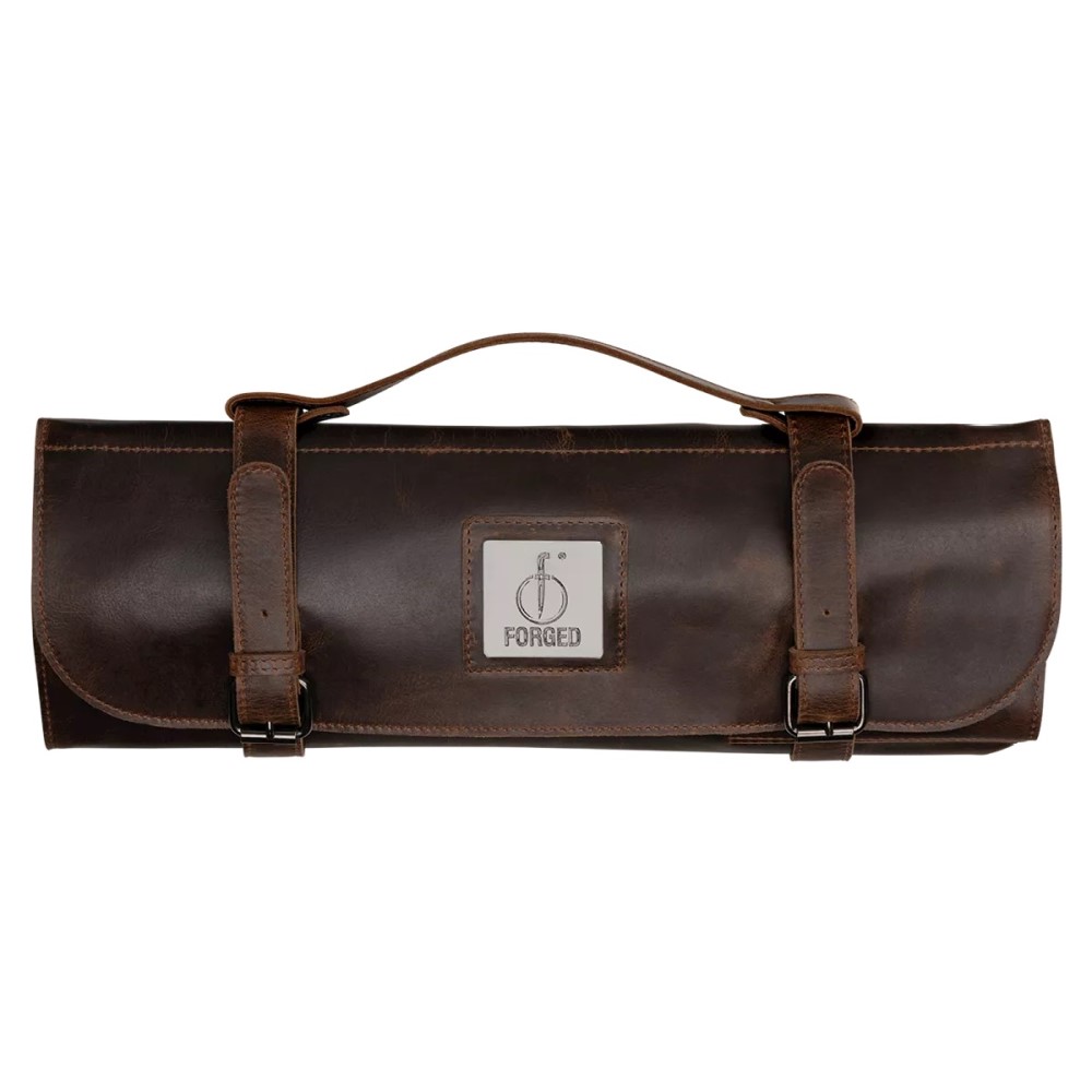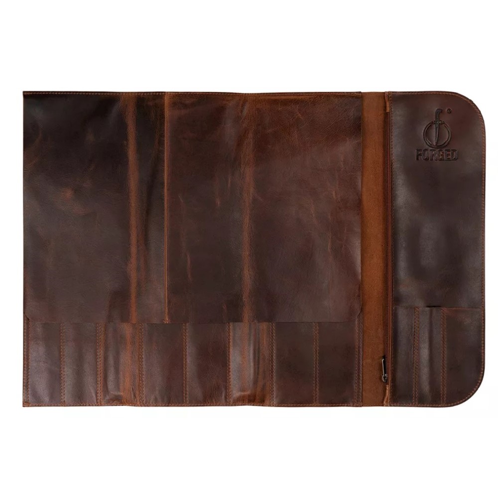 Met deze Forged Foedraal bescherm je je messen met stijl! Ambachtelijk gemaakt van 100% pull-up rundleer en 1,5 mm dik. Biedt ruimte voor 8 messen en 3 compartimenten voor kleine voorwerpen of schilmesjes. Bevat een ruim apart vak dat sluit met een rits voor keukengerei. Ideaal voor het veilig transporteren of opbergen van je messen. Onderhoud de foedraal met de Forged onderhoudskit om hem in optimale conditie te houden. Het is normaal dat het leer door het uitrekken wat lichter wordt. Leer wordt met gebruik steeds mooier en gaat een leven lang mee bij goed onderhoud. Ga voor de ultieme stoere look en ongeëvenaarde kwaliteit met Forged.