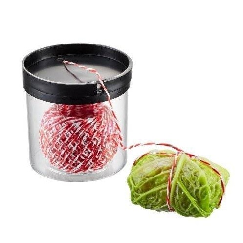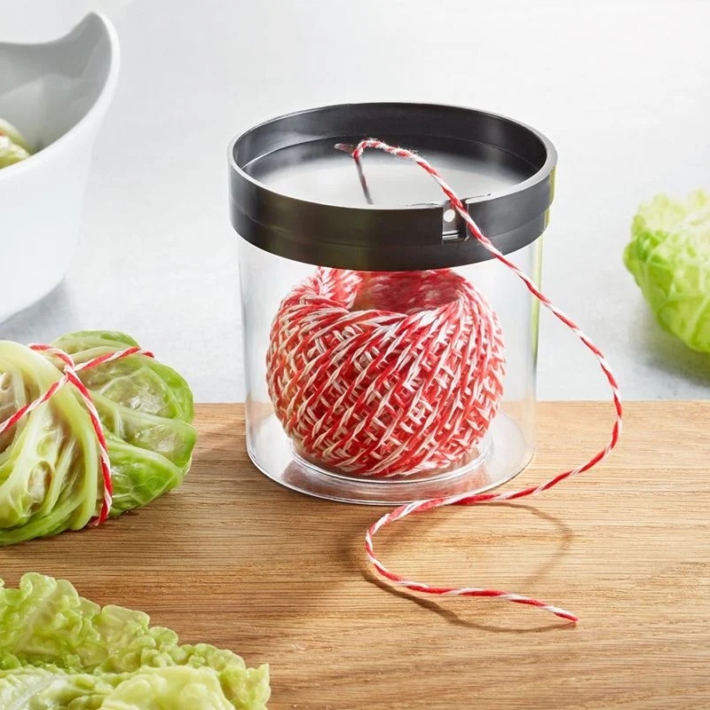 Wil je zelfgemaakte rollade of een heerlijke geroosterde kip maken? Dan heb je zeker een stevig GEFU Slagerstouw nodig. Dit extreem sterke slagerstouw van Gefu is hittebestendig tot 175 °C en heeft geen invloed op de smaak van je ingrediënten. Het touw heeft een lengte van 50 meter en wordt geleverd in een handige box met deksel waar een snijmechanisme in is verwerkt waardoor je een schaar niet eens nodig hebt. Losse bollen touw zijn verkrijgbaar om de box bij te kunnen vullen.