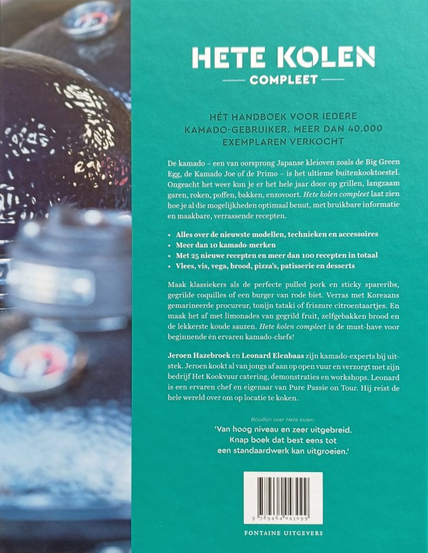 Steeds meer mensen koken met de Kamado, een Japanse kleioven zoals de Monolith, Big Green Egg en de Kamado Joe. Het koken met een kamado kan het hele jaar door. Hete kolen compleet is de herziene uitgave van de bestsellers Hete kolen en Hete kolen – het receptenboek. In het boek worden niet alleen de nieuwste technieken behandeld, je vind er ook originele en verrassende recepten voor vlees, groenten en zoete gerechten van de barbecue. Auteurs Jeroen Hazebroek en Leonard Elenbaas geven in deze uitgave up-to-date uitleg voor elk merk Kamado, behandelen vijf nieuwe kooktechnieken en geven je twintig nieuwe recepten. Dit boek is de nieuwe bijbel voor zowel beginnende als gevorderde Kamado-koks en een echte must-have voor wanneer je een nieuwe Kamado barbecue aanschaft.