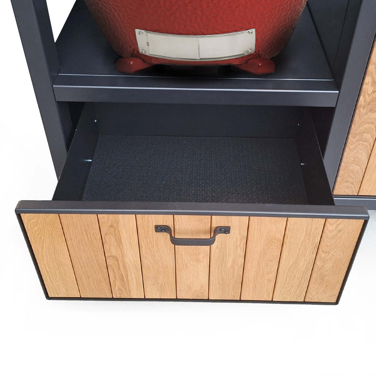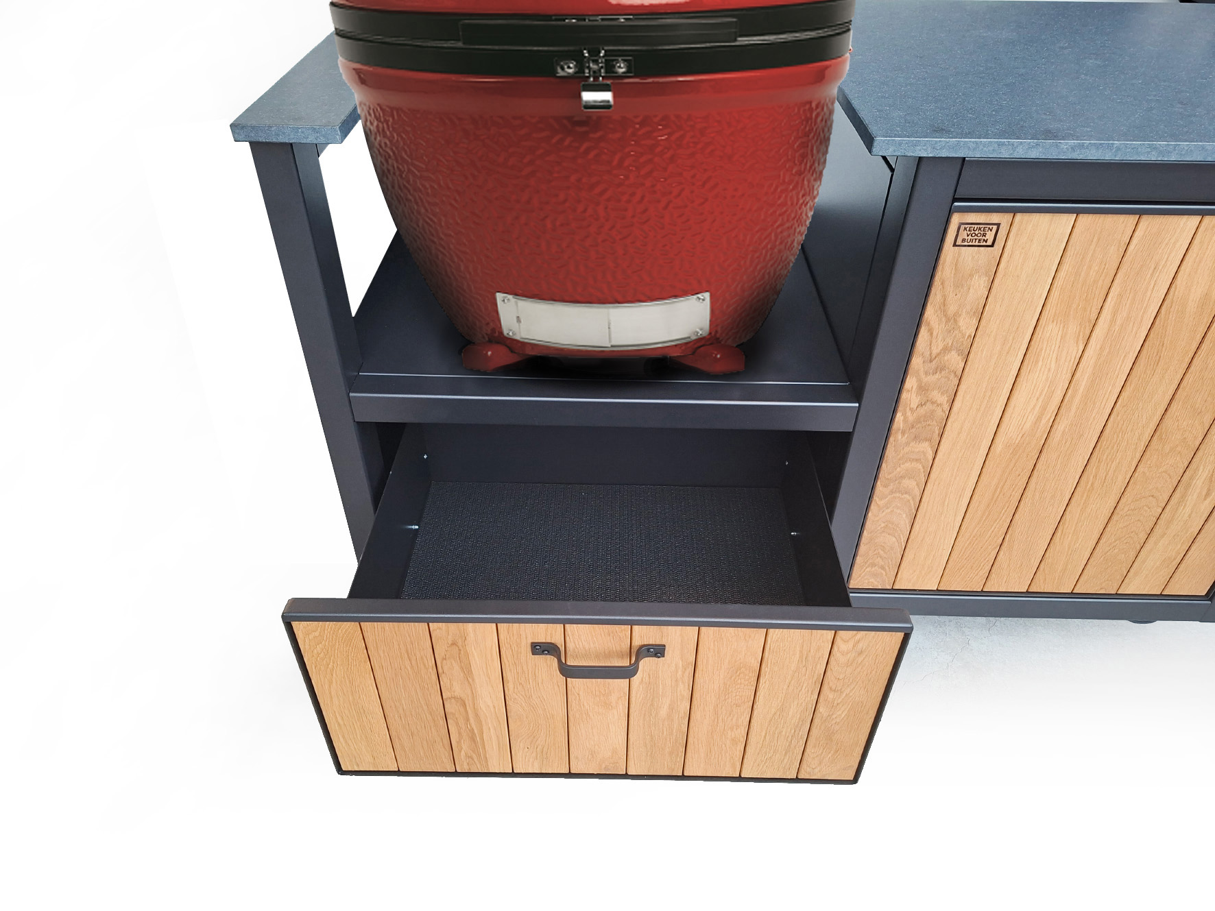 De basis van deze Keuken voor Buiten 2 met Kamado Joe Classic II is een oersterk onderstel van gepoedercoat staal met voorbehandeling zinkfosfatering, standaard in een zwarttint (RAL 9004). Het werkblad is van graniet in de kleur Zimbabwe Nero met afwerking Leather. Met de speciale behandeling is hij vlekvrij. Het kastdeurfront met push-to-open sluiting is van staal met hierin massief eikenhouten planken verwerkt. De 70 cm. brede lade onder het Kamado-schap is uitgevoerd met greep en push-to-open- en soft-close-functie.