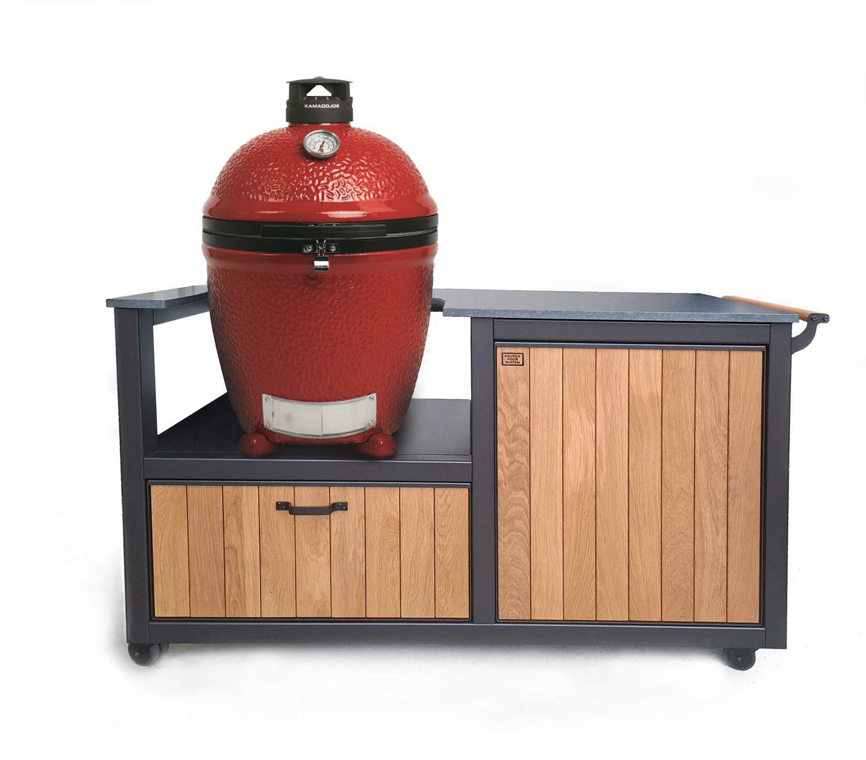 De basis van deze Keuken voor Buiten 2 met Kamado Joe Classic III is een oersterk onderstel van gepoedercoat staal met voorbehandeling zinkfosfatering, standaard in een zwarttint (RAL 9004). Het werkblad is van graniet in de kleur Zimbabwe Nero met afwerking Leather. Met de speciale behandeling is hij vlekvrij. Het kastdeurfront met push-to-open sluiting is van staal met hierin massief eikenhouten planken verwerkt. De 70 cm. brede lade onder het Kamado-schap is uitgevoerd met greep en push-to-open- en soft-close-functie.