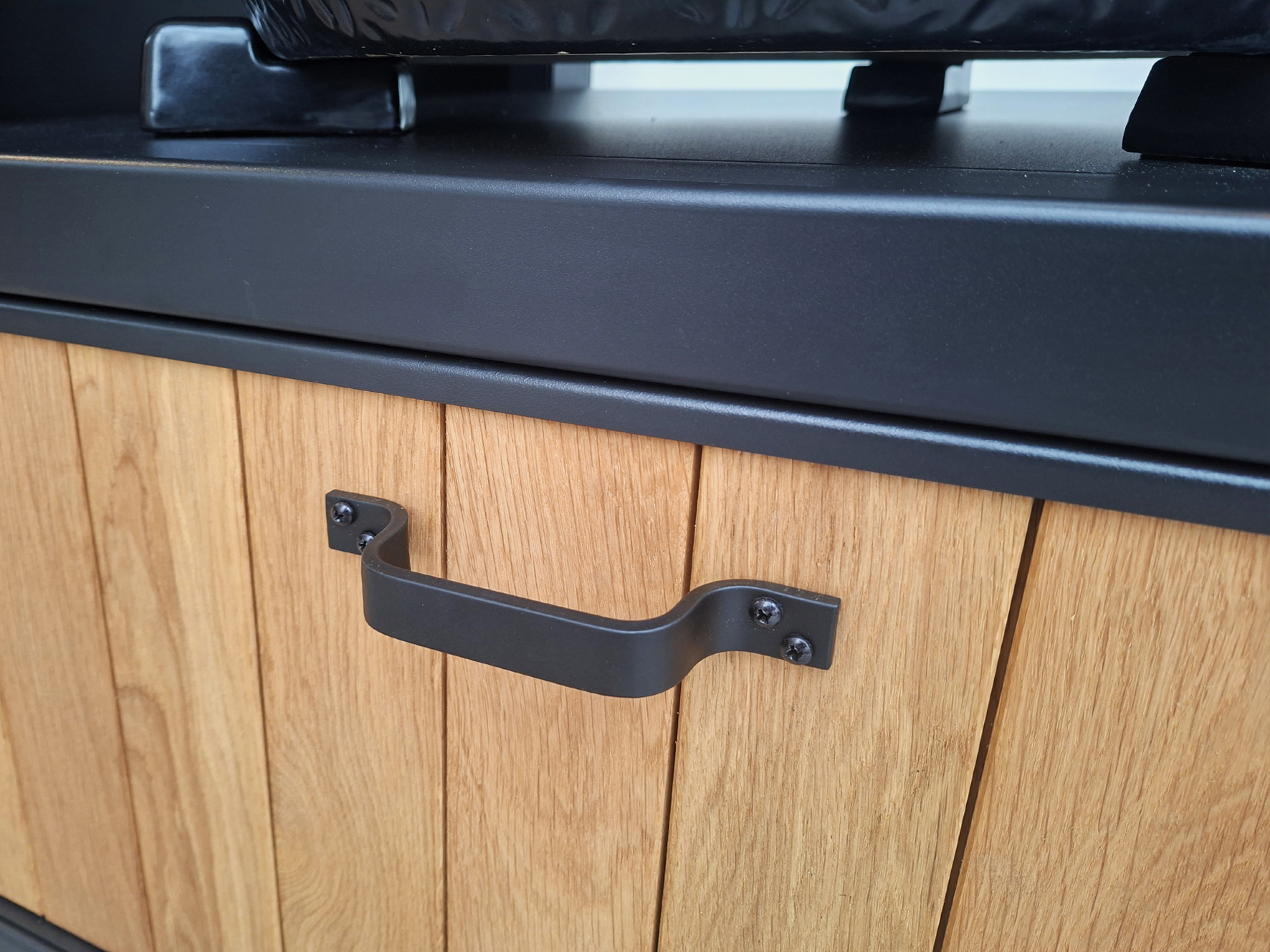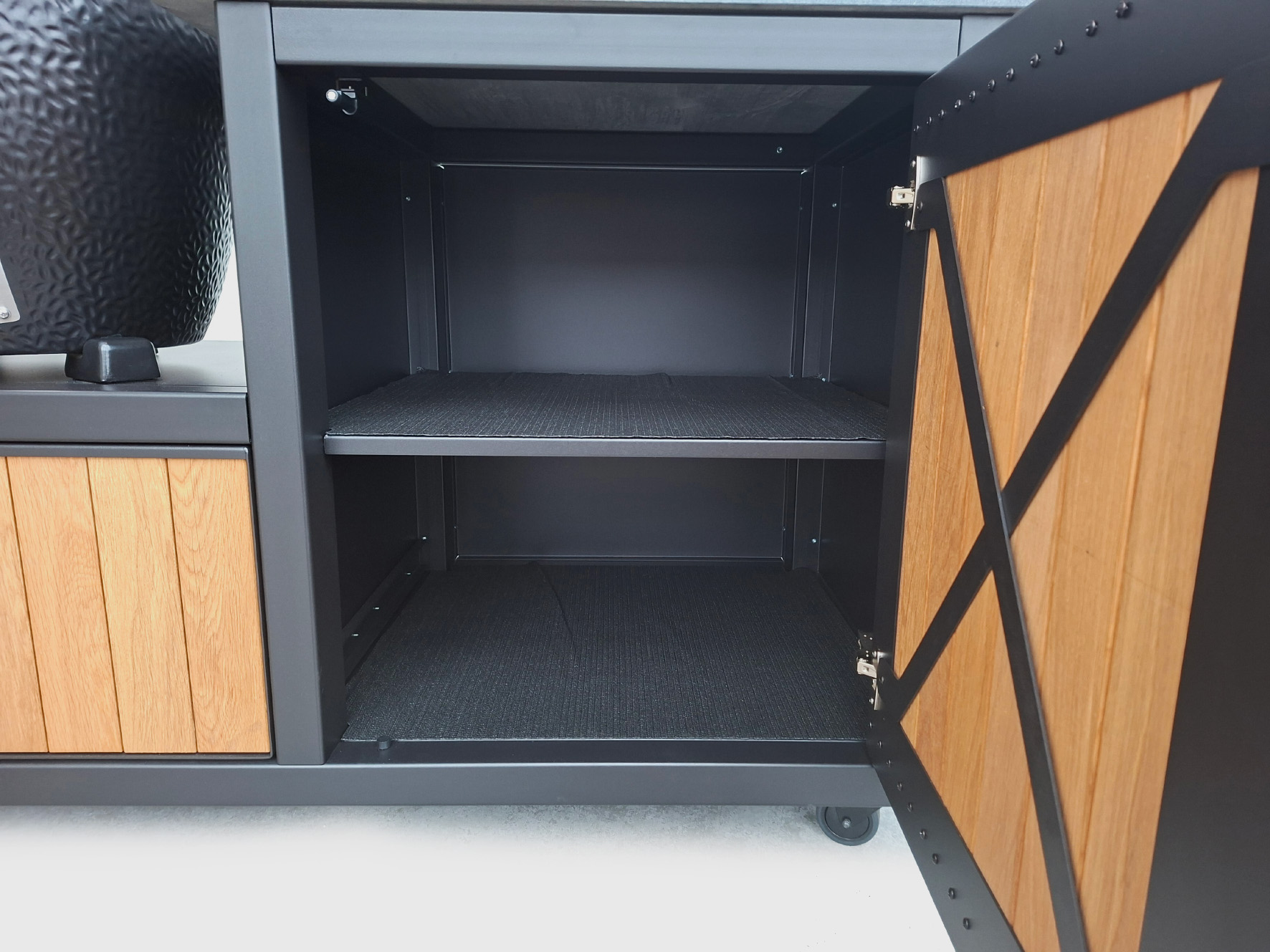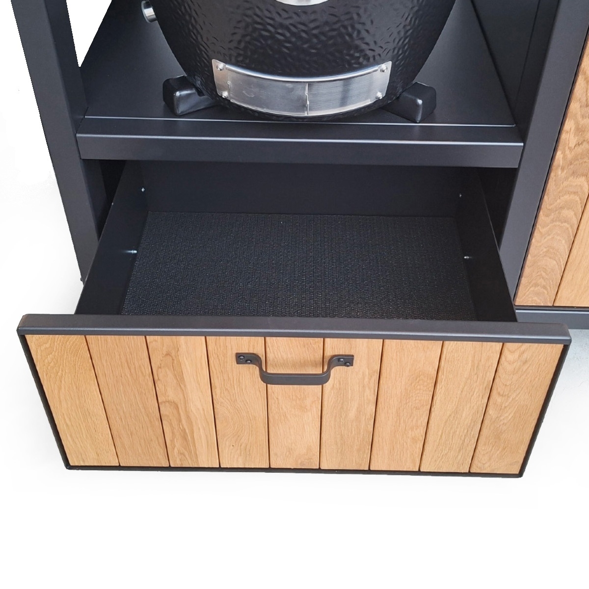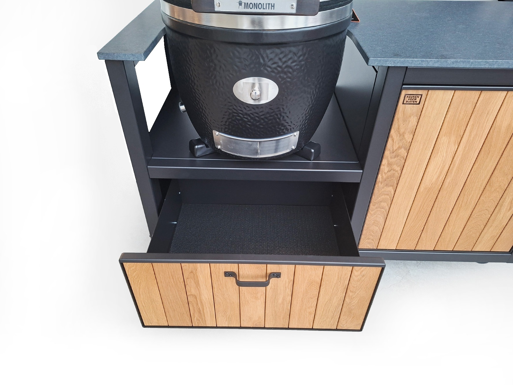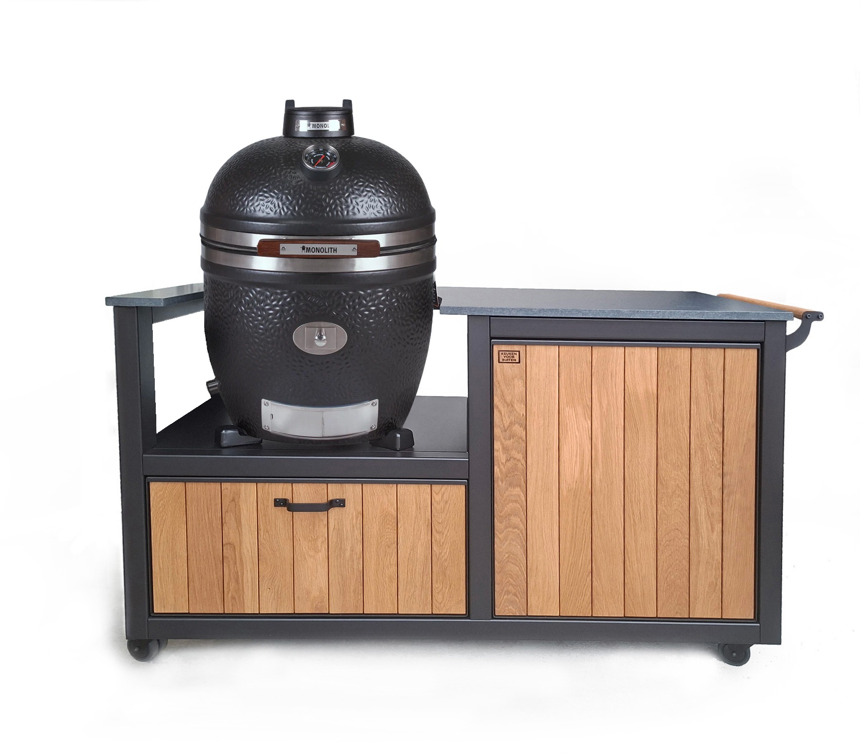 De basis van deze Keuken voor Buiten 2 met Monolith AVG.55 is een oersterk onderstel van gepoedercoat staal met voorbehandeling zinkfosfatering, standaard in een zwarttint (RAL 9004). Het werkblad is van graniet in de kleur Zimbabwe Nero met afwerking Leather. Met de speciale behandeling is hij vlekvrij. Het kastdeurfront met push-to-open sluiting is van staal met hierin massief eikenhouten planken verwerkt. De 70 cm. brede lade onder het Kamado-schap is uitgevoerd met greep en push-to-open- en soft-close-functie.
