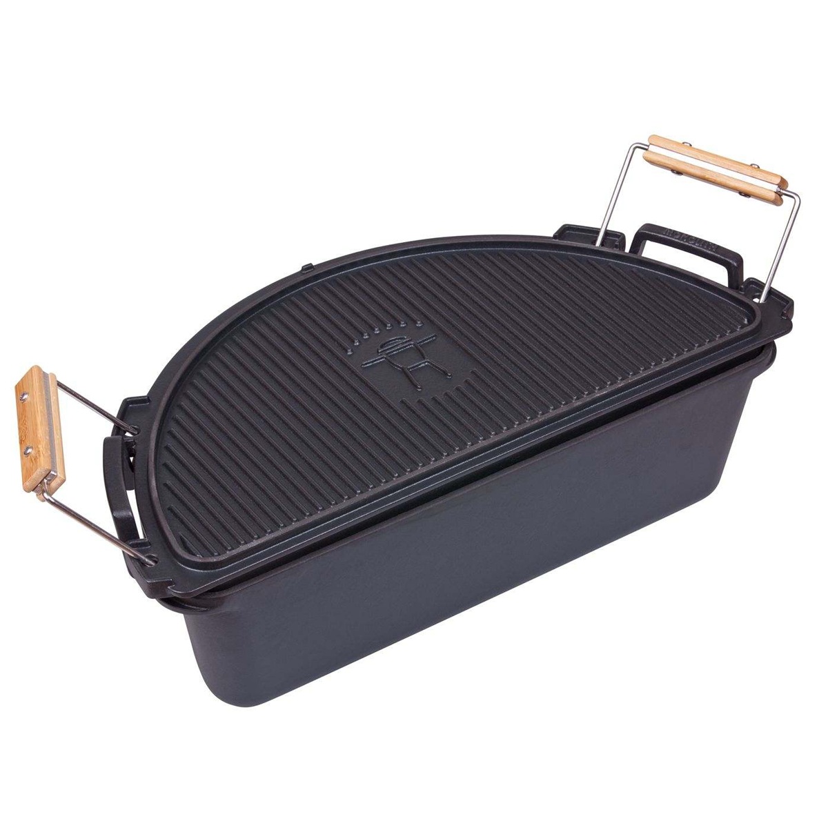 Standaard wordt er een verhoogd RVS rooster meegeleverd welke past in de gietijzeren pan om op verschillende hoogtes te garen. Dit verhoogd rooster is eventueel ook geschikt om op je bestaand RVS rooster te gebruiken. De deksel van de pan is ook te gebruiken als diepe plancha of keer hem om en gebruik hem als grillplaat. Waardoor je gemakkelijk de culinaire mogelijkheden van de Monolith vergroot. Je Kamado wordt daardoor een nog veelzijdigere buitenkeuken. De gietijzeren pan is makkelijk te verplaatsen door de handvatten aan de zijkant en de deksel/plancha is door de meegeleverde hendels eenvoudig en veilig weg te halen. De pan is gemaakt van 4 mm dik gietijzer en is beschikbaar in twee varianten. De variant voor de Monolith .55 is 6,5 liter en de Monolith .66 is 9,5 liter