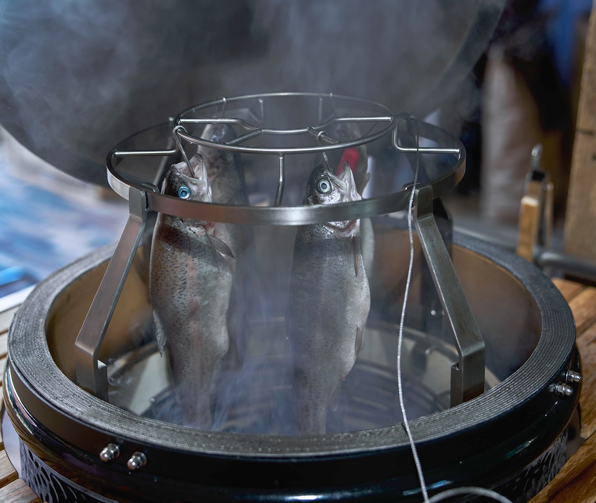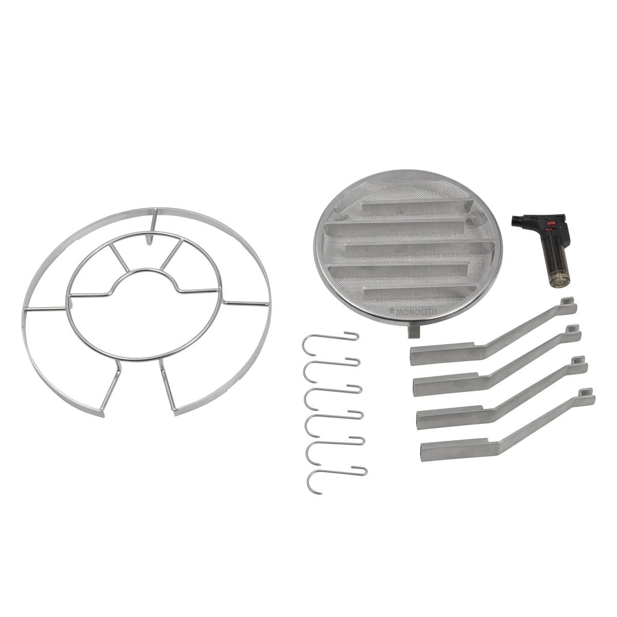 Het roken op een Monolith wordt nog beter en leuker. Na het bekende rookhouttoevoer systeem, komt Monolith nu met de innovatieve Smoke Set om koud of warm te roken. Een perfecte aanvulling voor alle barbecue liefhebbers die hun Monolith willen upgraden naar een professionele smoker. Het hoogwaardige, speciale opzetstuk van massief roestvrijstaal past perfect op het Smart Rooster Systeem (SRS) van Monolith. Dankzij de doordachte constructie met vier stevige poten biedt het voldoende ruimte om zelfs grotere stukken zoals vis, vlees, kaas of kruiden veilig en gemakkelijk op te hangen. het rokend hart van deze set is de geïntegreerde rookgenerator, die snel en gelijkmatig kan worden aangestoken door de meegeleverde gasbrander. Met deze Smoke Set kun je nog meer uit je Monolith halen om zo je zelf en je gasten te verbazen met heerlijke gerechten.