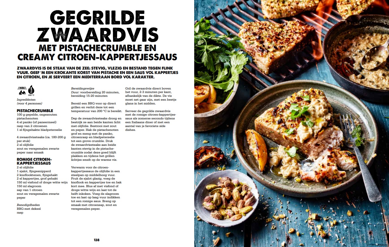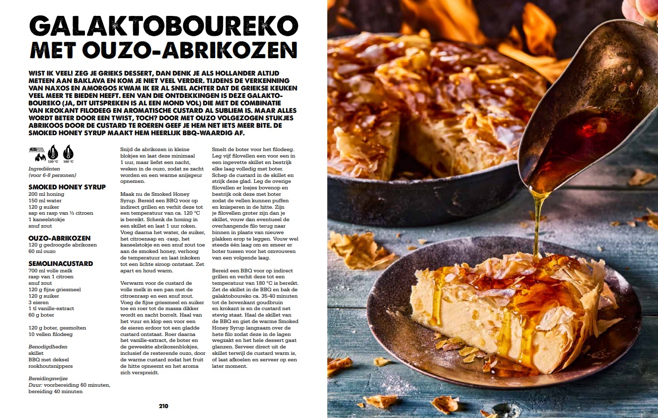 Verwacht gerechten als Smoked Iberico Rib Fingers met saffraan-yoghurtdip, gegrilde zwaardvis met pistachecrumble en romige citroen-kappertjessaus, en desserts zoals galaktoboureko met ouzo-abrikozen. Naast recepten vind je in het boek BBQ-technieken en reisverhalen die laten zien waar deze smaken vandaan komen.