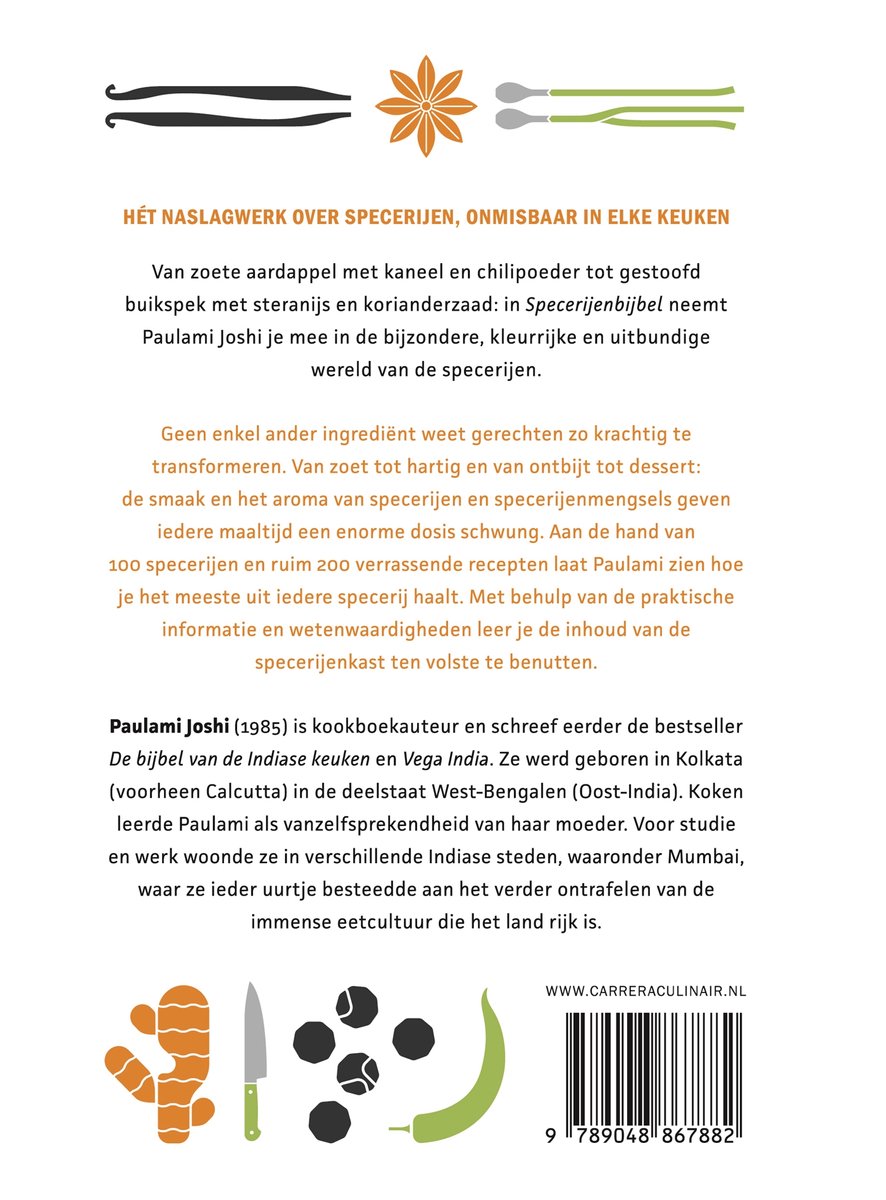 Geen enkel ander ingrediënt weet gerechten zo krachtig te transformeren. Van zoet tot hartig en van ontbijt tot dessert; de smaak en het aroma van specerijen en specerijenmengsels geven iedere maaltijd een enorme oppepper. Aan de hand van 100 specerijen en ruim 200 verrassende recepten voor ieder moment van de dag, laat Paulami zien hoe je het meeste uit iedere specerij haalt. Met behulp van de praktische informatie en weetjes leer je de inhoud van de specerijenkast ten volste te benutten.
