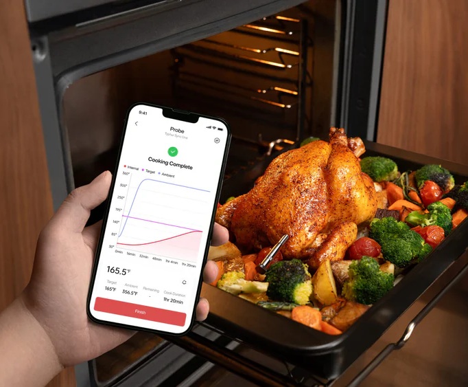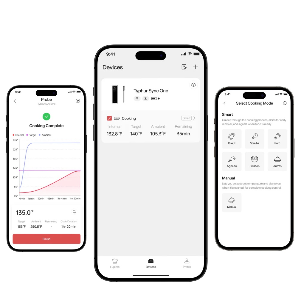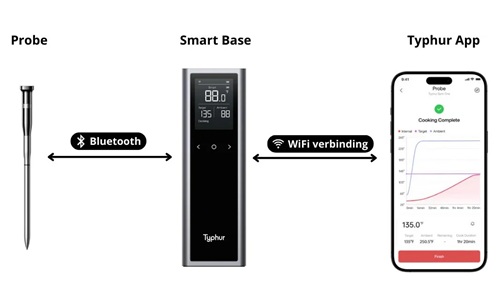 De geavanceerde Bluetooth 5.3-verbinding van de Sync heeft een bereik tot 122 meter in open ruimte en tot 41 meter in een afgesloten ruimte. Bedien je Typhur met onbeperkt bereik vanaf elke locatie met een wifi-verbinding. Zo houd je eenvoudig de voortgang van je maaltijd in de gaten.