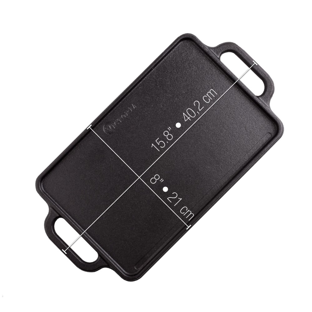 De Victoria Plancha 2-zijdig is perfect om heerlijk vlees, vis en groenten te grillen. En op de gladde zijde kun je pannenkoeken, een gebakken ei of een heerlijke omelet bakken. De van gietijzer gemaakte Victoria plancha houdt uitzonderlijk veel hitte vast en verdeelt deze zodanig dat het eten gelijkmatig gaar wordt, of je nu een buitenshuis ontbijt klaarmaakt of een heerlijk gebakken avondmaal.