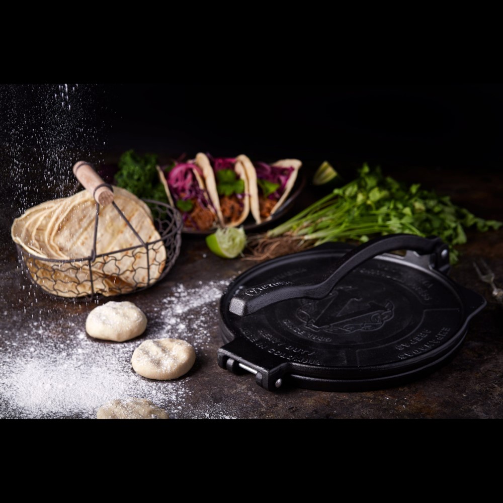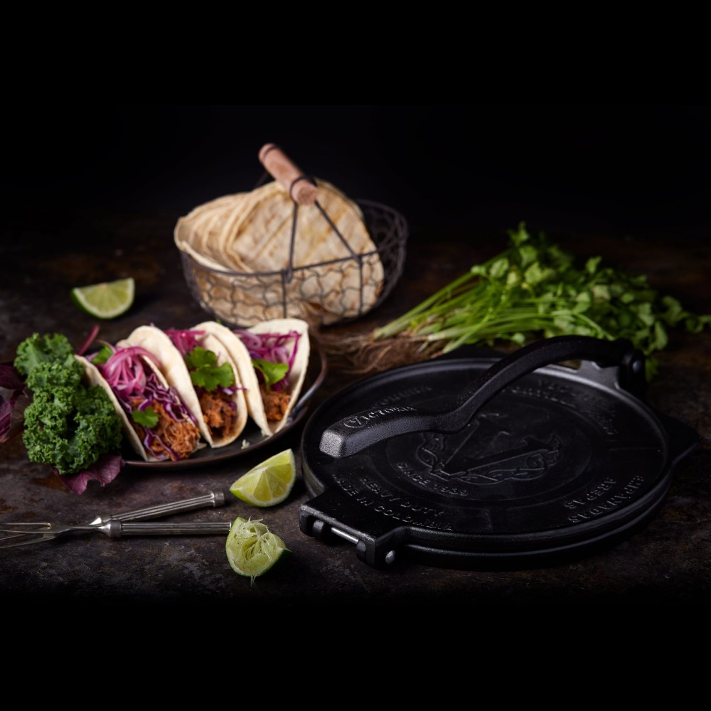 Je eigen tortilla’s maken…easy met deze Victoria Tortillapers van gietijzer. Maak je favoriete deeg (wij zijn fan van maismeel tortilla’s) en rol daar een bolletje van. Plaats deze in de pers en druk deze dicht. Door het hefboomeffect hoef je niet eens hard te drukken en kan je de tortilla zo dik of dun maken als je zelf wil. Als je bakpapier op beide zijde van de pers legt kan je de tortilla’s ook heel gemakkelijk verwijderen en heb je veel minder meel nodig.